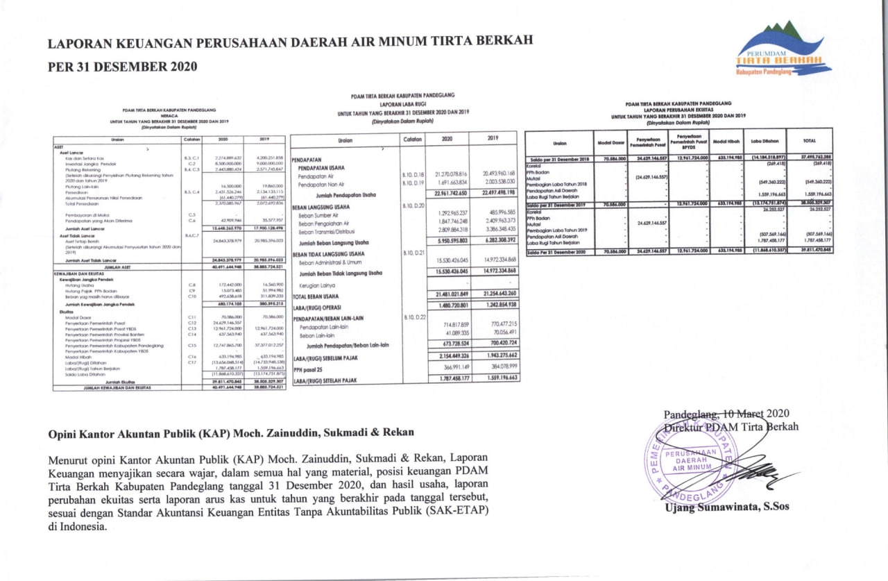 Berikut kami sajikan Laporan Keuangan Perusahaan Umum Daerah Air Minum Tirta Berkah Tahun 2020